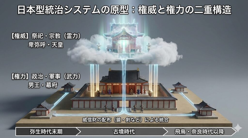 さて、ここからがいよいよ本題となる【権力構造】の核心部分ですが、卑弥呼という女王がどのような方法で国を治めていたのかを探っていくと、そこには現代の政治システムにも通じるような、非常に洗練された『二重統治』の仕組みが隠されていたことが見えてきます。
