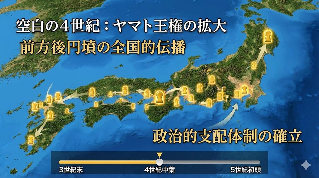 この空白の期間に一体何が起きたのか、邪馬台国はどうなったのか、という点については様々な憶測が飛び交っていますが、考古学的な視点で見ると、この時期に前方後円墳という共通の墓制が九州から東北南部まで急速に広まっている事実があり、これはヤマト王権を中心とする政治的な支配体制が、この4世紀の間に列島規模で確立されたことを示唆しています。