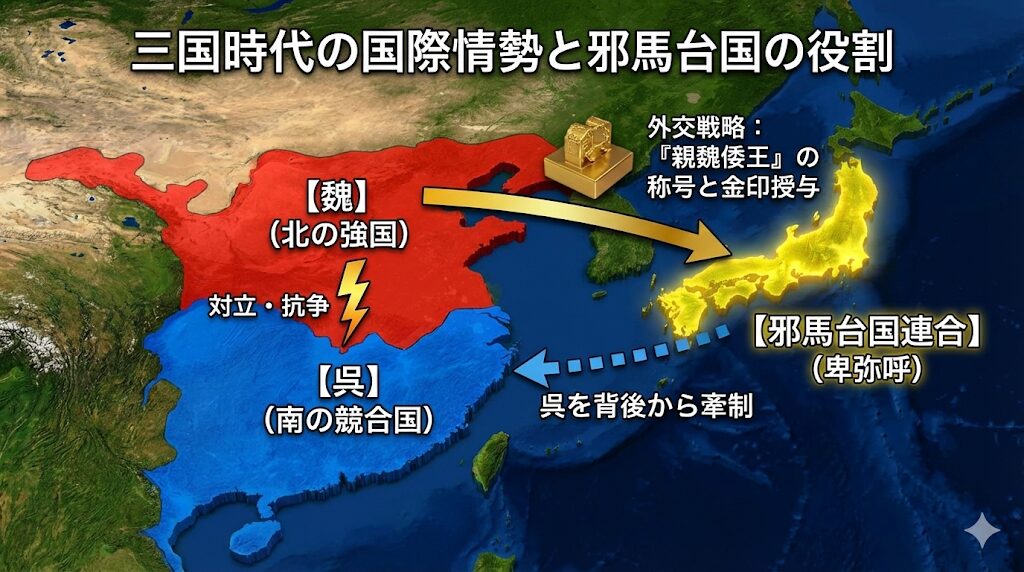 ここで注目すべきは、当時の中国、つまり魏の国が、東の果てにある小さな島国の女王に対して『親魏倭王』という、金印と共に与えた非常に高い称号の存在であり、これは当時の国際情勢において、魏が南の『呉』という国と対立しており、背後から呉を牽制させるために日本の勢力を利用しようとした外交戦略の一環であったとも考えられます。