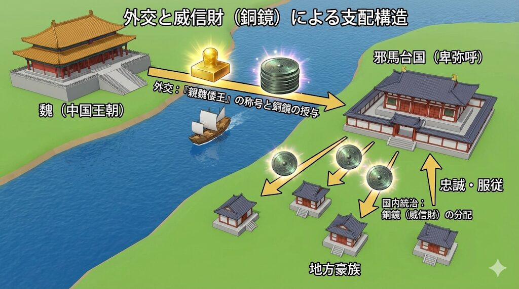 そしてもう一つ、卑弥呼の権力を支えていた重要な柱が、先ほど少し触れた魏との外交関係であり、彼女は239年に魏へ使いを送り『親魏倭王』の称号と多数の銅鏡を受け取ったわけですが、この銅鏡こそが、彼女の呪術的な力を視覚的に強化し、地方の豪族たちに分け与えることで忠誠を誓わせるための、極めて強力な【威信財】として機能していました。
