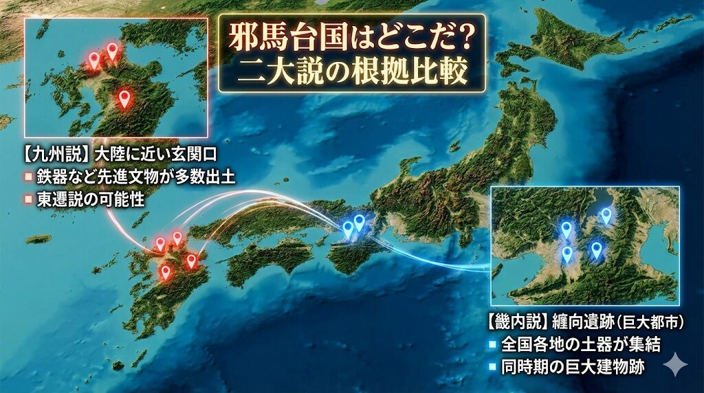 ただ、現在の考古学界における主流な見方としては、奈良県の『纒向遺跡』を中心とする畿内説が有力視されつつあり、これは同時期の巨大な建物跡や、全国各地から持ち込まれた土器が大量に出土していることから、ここが列島規模の交流センター、つまり初期の都市機能を備えた首都であった可能性が極めて高いと考えられているからです。
