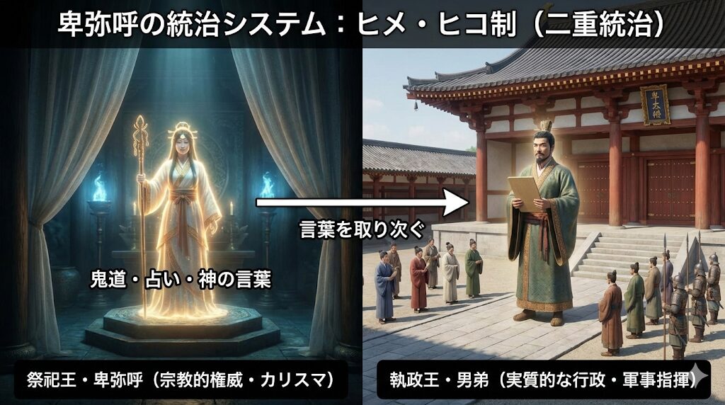 これは、表向きには姿を見せない神聖な権威としての『祭祀王』である卑弥呼と、その権威を背景に現実的な政治を行う『執政王』としての弟という、役割分担が明確になされた【ヒメ・ヒコ制】と呼ばれる日本古代特有の統治スタイルであり、このシステムがあったからこそ、女性である卑弥呼が血なまぐさい争いの表舞台に立つことなく、神聖性を保ち続けることができたのです。